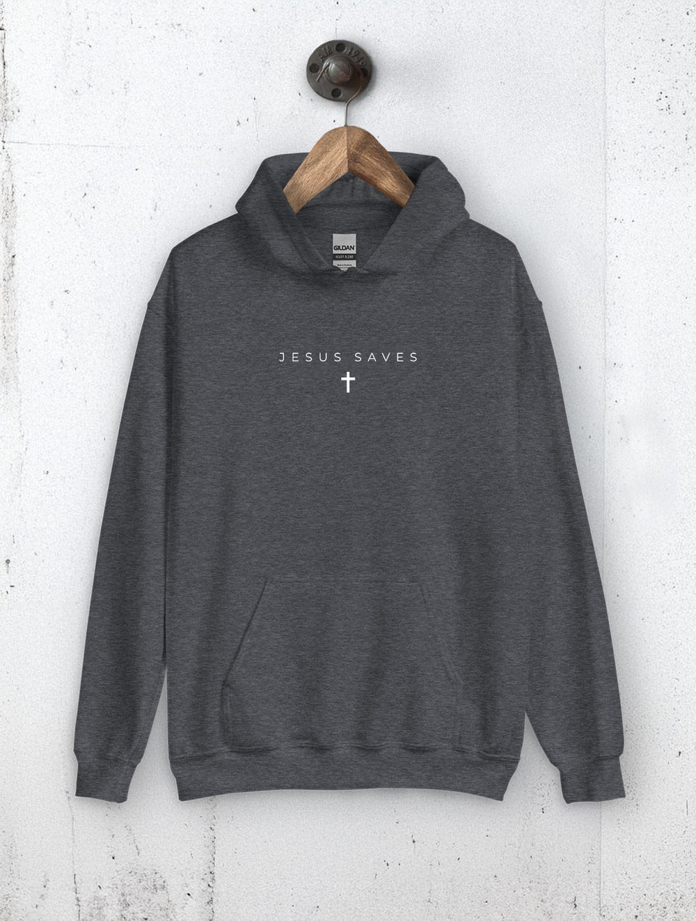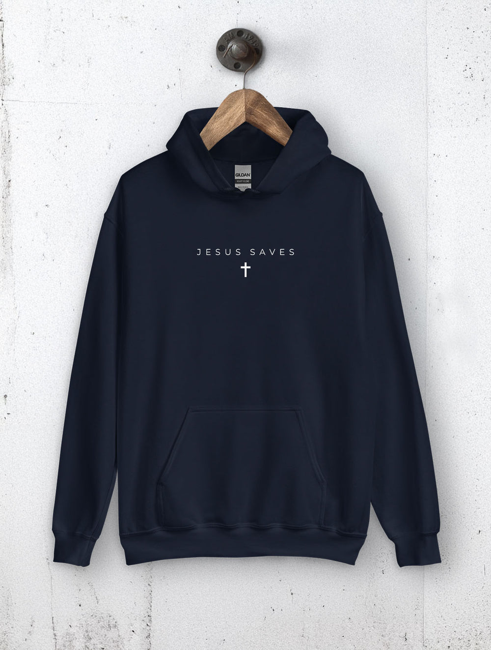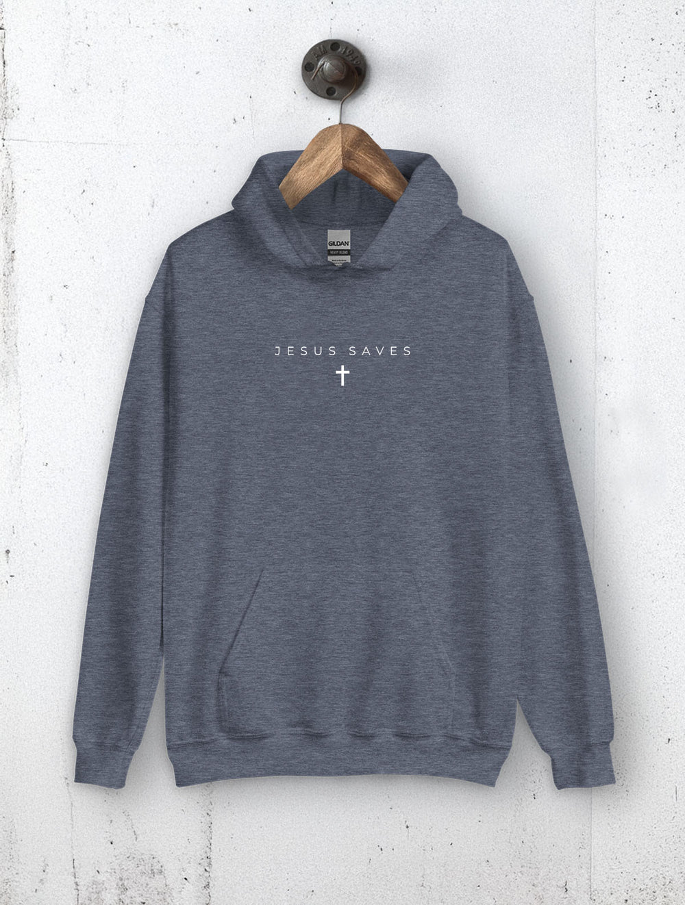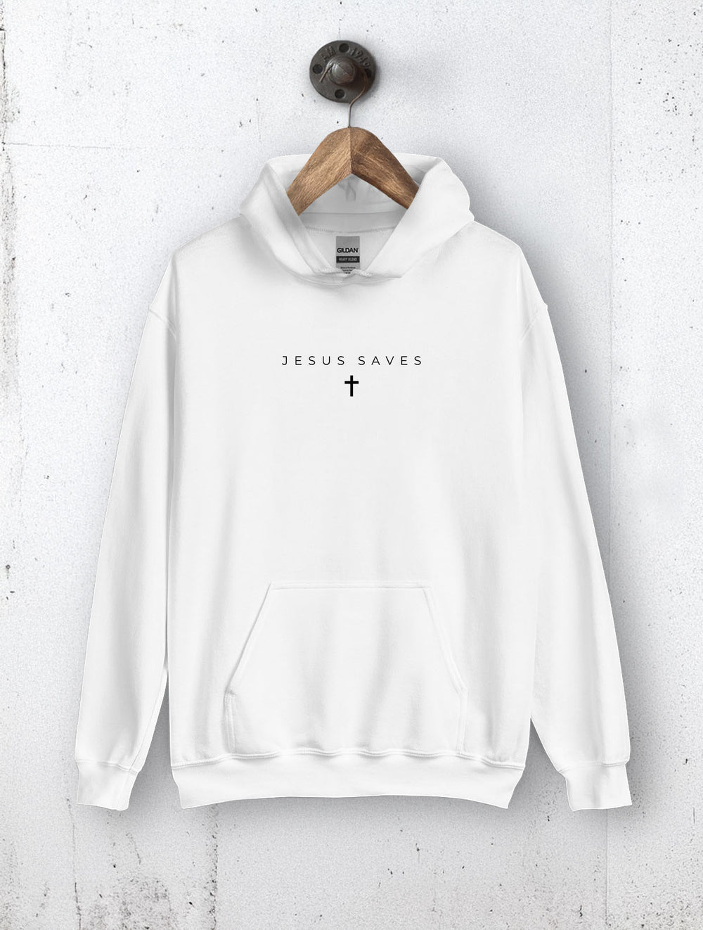 'Jesus saves' in simple, clean font with a small cross graphic underneath.