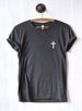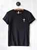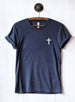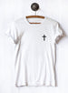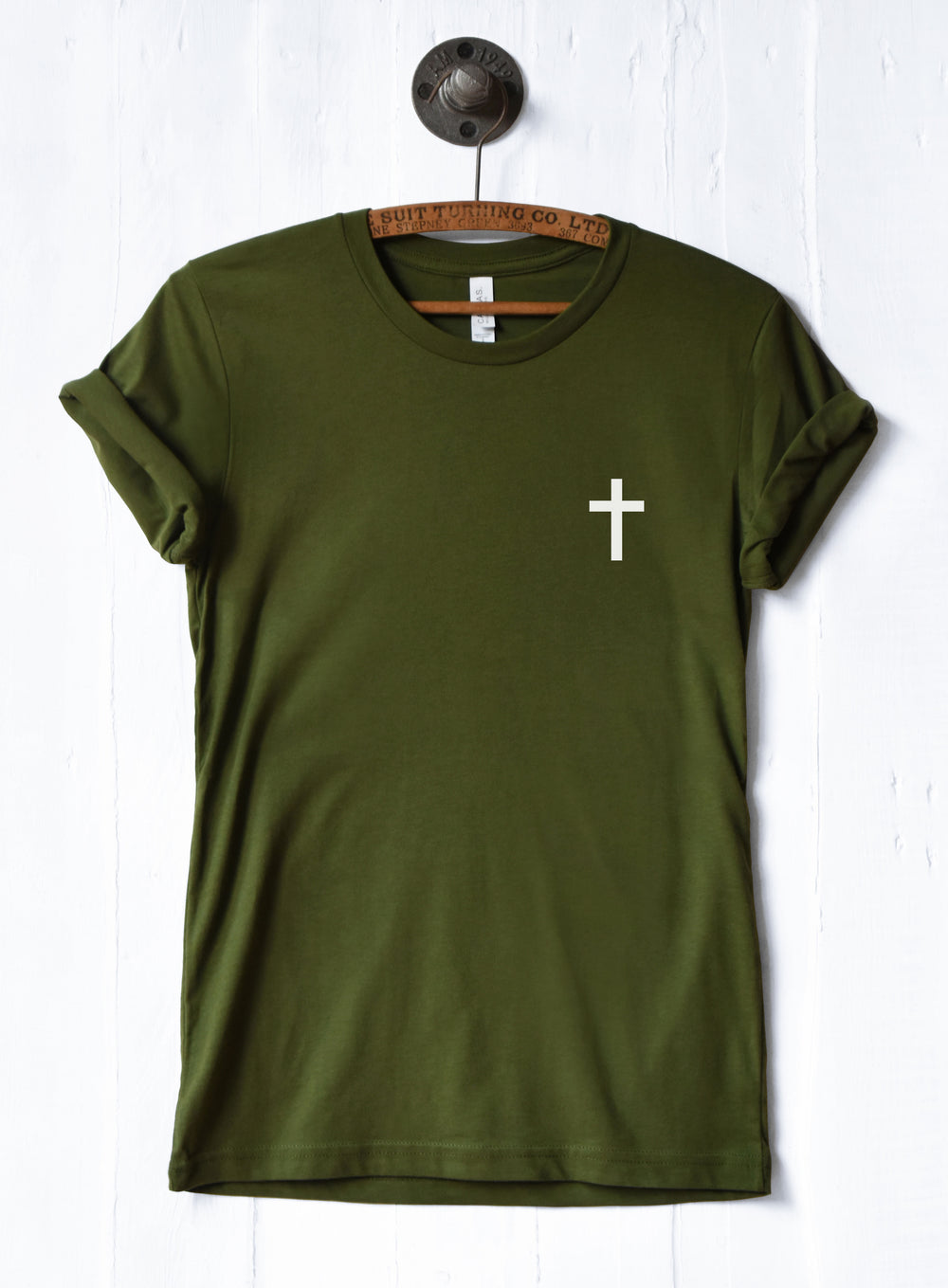 A simple small cross graphic on the left side of the chest. Subtle but mighty.