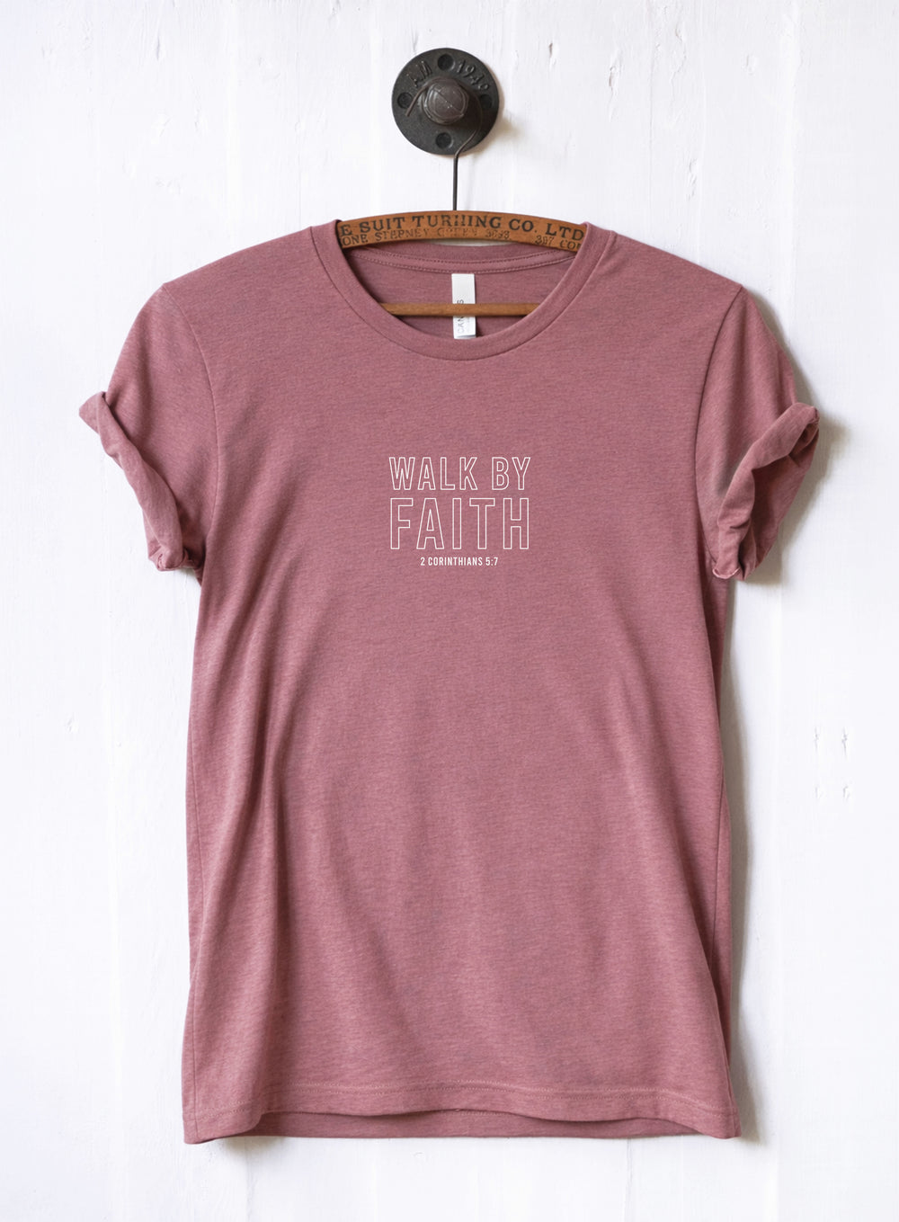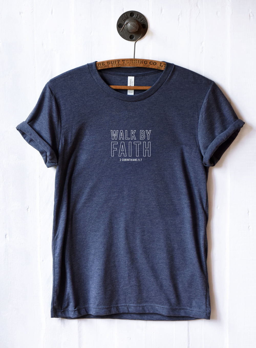 'Walk by faith' in simple, modern outline font with '2 Corinthians 5:7' in a solid font below.